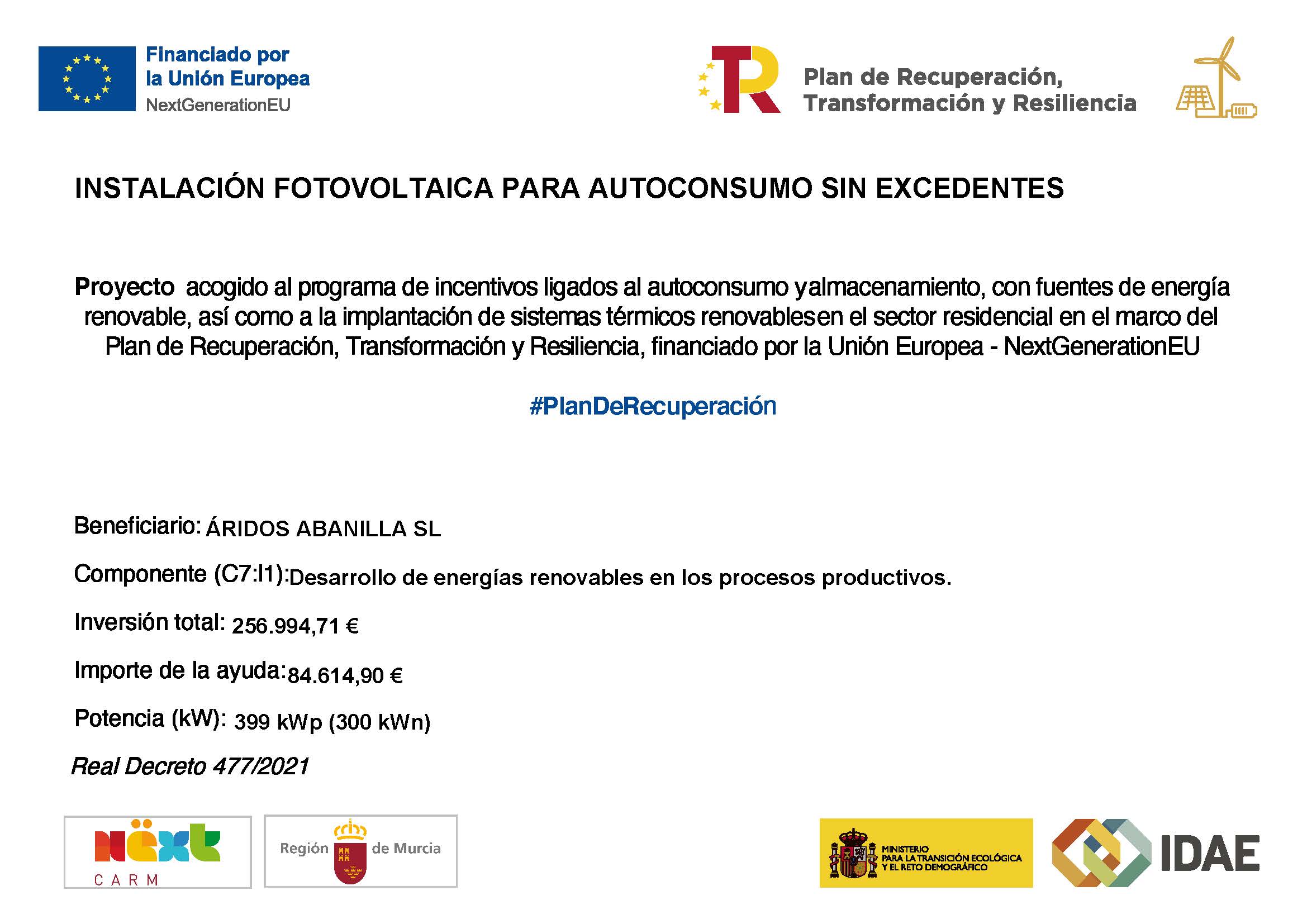 Áridos Abanilla ha recibido una subvención acogido al programa de incentivos ligados al autoconsumo y almacenamiento, con fuentes de energía renovable.